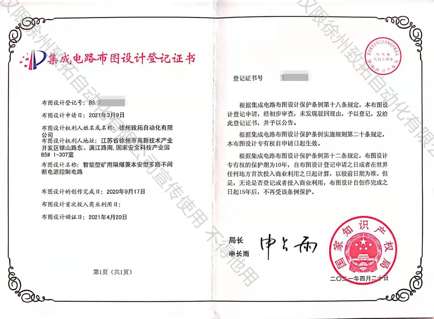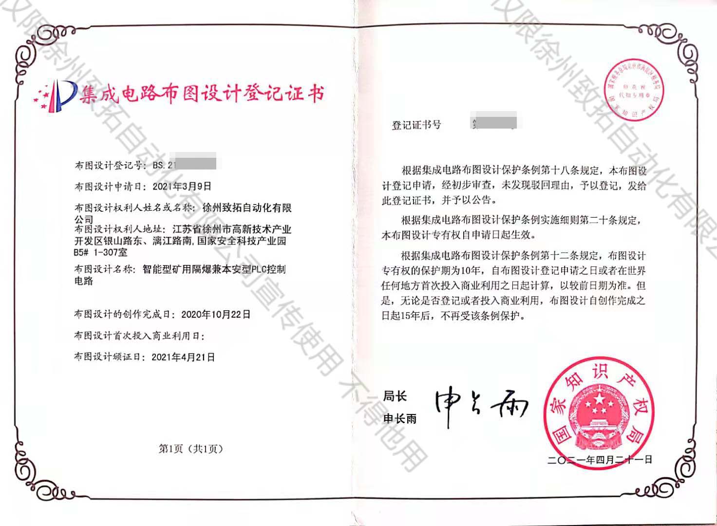 礦用隔爆兼本安型PLC控制電路設(shè)計(jì)登記證書